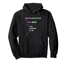 Funny programmer design styled like real code featuring “Function CoderLife()” and the lines While (Alive) { Eat(); //Sleep(); Code(); } in colorful coding text. Great gift idea for programmers, software developers, coders, computer science students, IT professionals, web developers, and tech geeks who love coding humor. 8.5 oz, Classic fit, Twill-taped neck