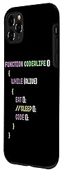 Funny programmer design styled like real code featuring “Function CoderLife()” and the lines While (Alive) { Eat(); //Sleep(); Code(); } in colorful coding text. Great gift idea for programmers, software developers, coders, computer science students, IT professionals, web developers, and tech geeks who love coding humor. Two-part protective case made from a premium scratch-resistant polycarbonate shell and shock absorbent TPU liner protects against drops Printed in the USA Easy installation