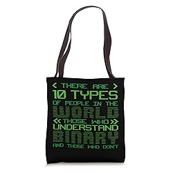 Programming Binary Code design. There are 10 types of people. Those who understand binary and those who don't understand it. Funny binary saying for programmers who write commands and codes with binary codes. Perfect gift for programmers and developers no matter what programming language. Fun outfit for computer science studies or for work if you love programming. 16” x 16” bag with two 14” long and 1” wide black cotton webbing strap handles. Made of a lightweight, spun polyester canvas-like fabric. All seams and stress points are double-stitched for durability, and the reinforced bottom flattens to fit more items and hold larger objects. Spot clean/dry clean only.