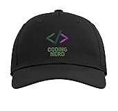 Brushstroke coding symbols paired with bold pixel-font “Coding Nerd,” expressing programmer pride and tech culture identity. Vibrant gradient tech design blends retro gaming aesthetics with modern coding symbolism for a fun, insider statement. Classic five-panel structured baseball hat with high-profile crown Adjustable fit; one size fits most adults