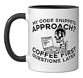 This design makes a great birthday or christmas present. Makes a perfect surprise for any programmer, computer software engineer, developer, coder out there. Programming and Software Engineering are your passion? This design reads: "My Code Snippets Approach? Coffee First Questions Later". Then this is made for you as a developer. 11-ounce ceramic mug is dishwasher and microwave-safe, lead and BPA free Features glossy finish with accent colors on interior, handle, and rim of two-tone designs