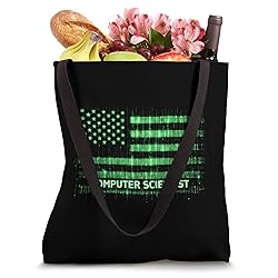 COMPUTER SCIENTIST programming 16” x 16” bag with two 14” long and 1” wide black cotton webbing strap handles. Made of a lightweight, spun polyester canvas-like fabric. All seams and stress points are double-stitched for durability, and the reinforced bottom flattens to fit more items and hold larger objects. Spot clean/dry clean only.