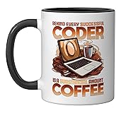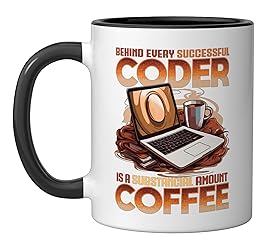 Funny computer programming caffeine joke laptop illustration with an espresso coffee motif stating "Behind Every Successful Coder Is A Substantial Amount Of Coffee" Careful not to spill your coffee on the backlit keyboard while writing a unique codec for gaming, spreadsheets, websites, apps or other cool computer program needs. 11-ounce ceramic mug is dishwasher and microwave-safe, lead and BPA free Features glossy finish with accent colors on interior, handle, and rim of two-tone designs
