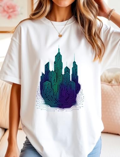 Step into the future with this electrifying t-shirt, showcasing a mesmerizing cityscape of circuit board skyscrapers. Perfect for tech enthusiasts and coders, the neon hues of electric blue, cyber green, and vivid purple create a sense of depth and energy that captivates the eye. Wearing this design makes you feel like a visionary, sparking conversations about innovation and the digital world. Embrace your passion for technology and stand out in any crowd.
