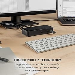 - The Thunderbolt 3 Dock Plus is the ultimate docking solution for your Mac or Windows laptop. This streamlined dock offers innovative solutions designed for both professional and at-home use. Enjoy super-fast data transfer speeds of up to 40 Gbps, high-definition dual monitor support, and 60W upstream charging. It also features multiple ports to connect your peripherals and networks via USB-A, USB-C, Ethernet, and more. Connect multiple devices to your laptop through a single dock. The best part is that you can connect all this to your Thunderbolt 3 or USB-C-enabled laptop through a single cable. FRONT: Thunderbolt 3 Type-C port with PD 3.0 delivers charging (up to 60W) to laptop with the included Thunderbolt 3 Gen 2 1.6 ft/0.5M cable; Audio in/out for mic and speaker support; 1 x USB-A 3.1 Gen 2 port for USB-A peripheralsBACK: Gigabit Ethernet connection; 2 x USB-A 3.1 Gen 1 ports for devices that connect via USB-A such as a mouse, keyboard or printer; 2 x USB-C 3.1 Gen 2 ports for USB-C peripherals; 2 x DisplayPort™ 1.4 connect to high-resolution monitors/displays (for resolutions, see table below) 125W PSU powers the dock, and also charges the connected laptop up to 60W.